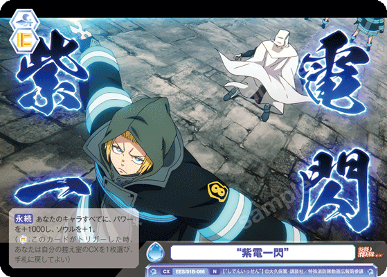 もう1つのCXコンボは「浅草の破壊王 新門 紅丸」を採用しています。アタック時に3ダメージか4ダメージを選んで相手に与えることができるので、2つのダメージを使い分けて勝利を目指しましょう。CXコンボの発動には2ストックが必要ですが、「第7特殊消防隊 相模屋 紺炉」の起動能力を使って紅丸を舞台に出すことで必要なストックを温存することができます。