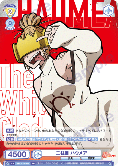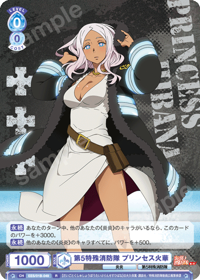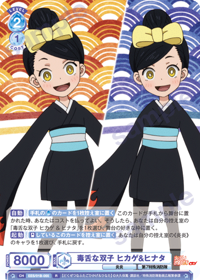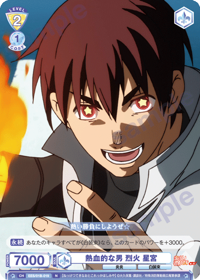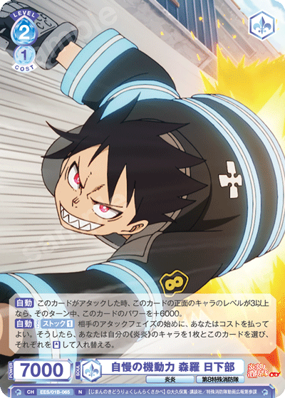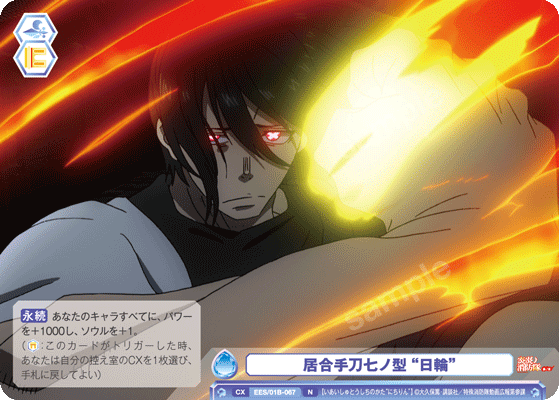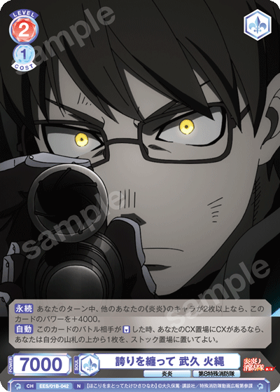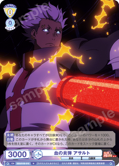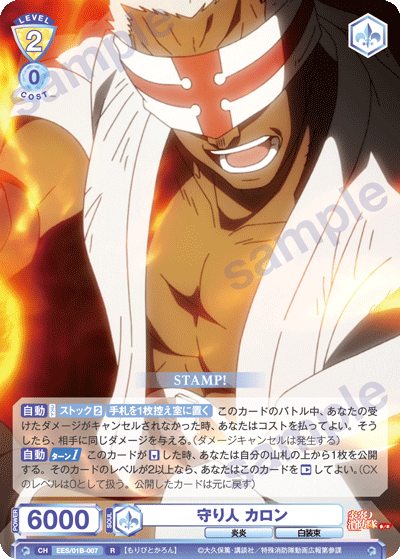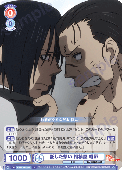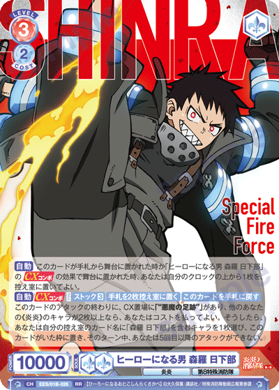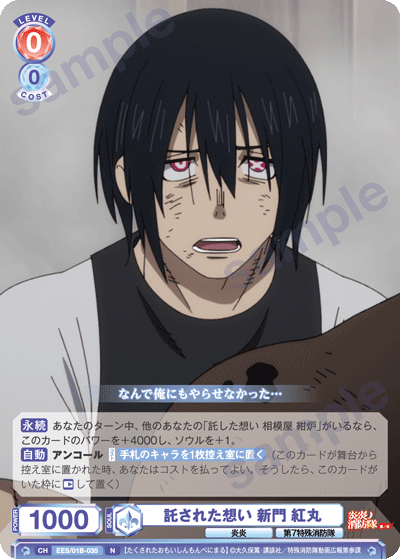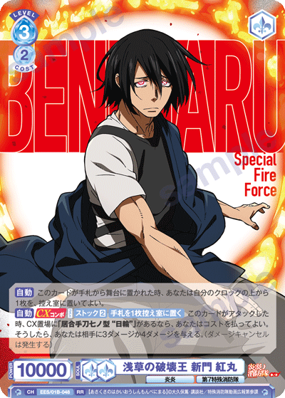 もう1つのCXコンボは「浅草の破壊王 新門 紅丸」を採用しています。アタック時に3ダメージか4ダメージを選んで相手に与えることができるので、2つのダメージを使い分けて勝利を目指しましょう。CXコンボの発動には2ストックが必要ですが、「第7特殊消防隊 相模屋 紺炉」の起動能力を使って紅丸を舞台に出すことで必要なストックを温存することができます。