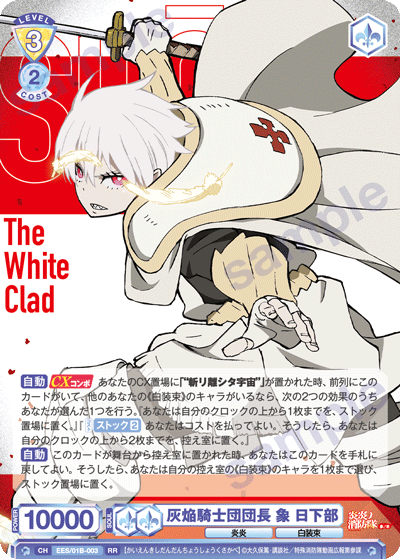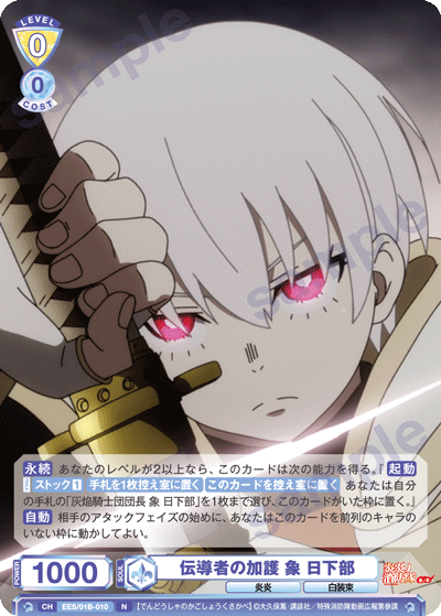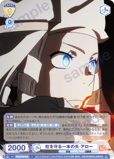 「灰焔騎士団団長 象 日下部」はレベル3のカードですが、「伝導者の加護 象 日下部」の起動能力を使うことで、レベル2の段階から場に出すことができます。CXコンボではクロックを減らすことができるので、早いタイミングから発動することで、ダメージレースを優位に進めましょう。「柱を守る一本の矢 アロー」は後列にいることで追加でダメージを与えることができるので、攻守ともに相性の良いカードです。
