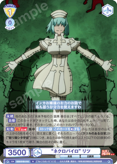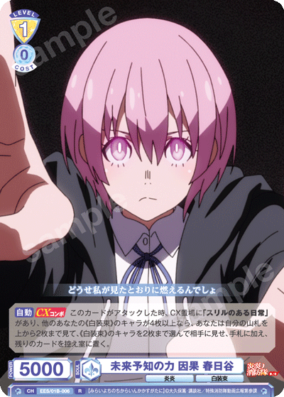レベル1のタイミングでは「未来予知の力 因果 春日谷」のCXコンボを狙っていきましょう。場に≪白装束≫のキャラを5枚そろえる必要がありますが、1回のCXコンボで最大2枚手札を増やすことができる能力です。「“ネクロパイロ” リツ」がいれば、アタックした時に山札の上を操作できる能力を得るので、手札を増やしやすくなります。
