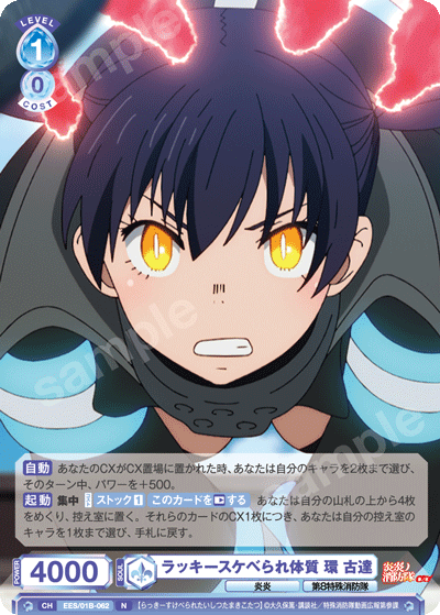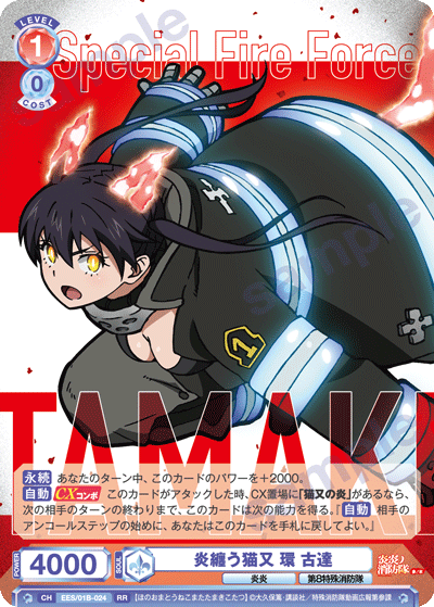 1つ目のCXコンボのカード、「炎纏う猫又 環 古達」はレベル1で、相手のアンコールステップに手札に戻る能力を持っています。相手に